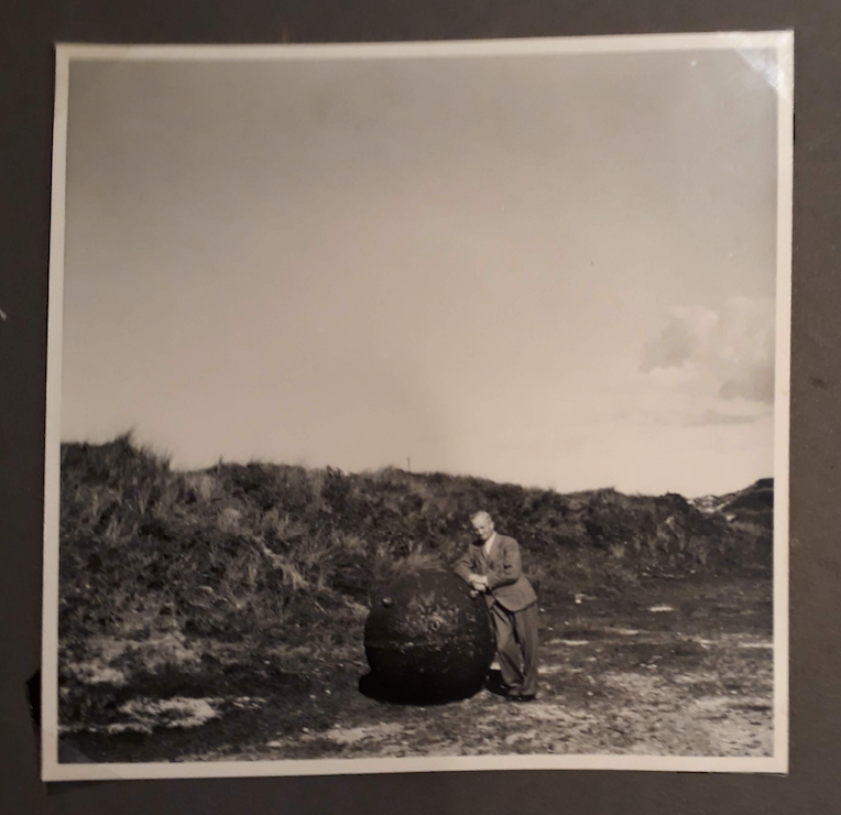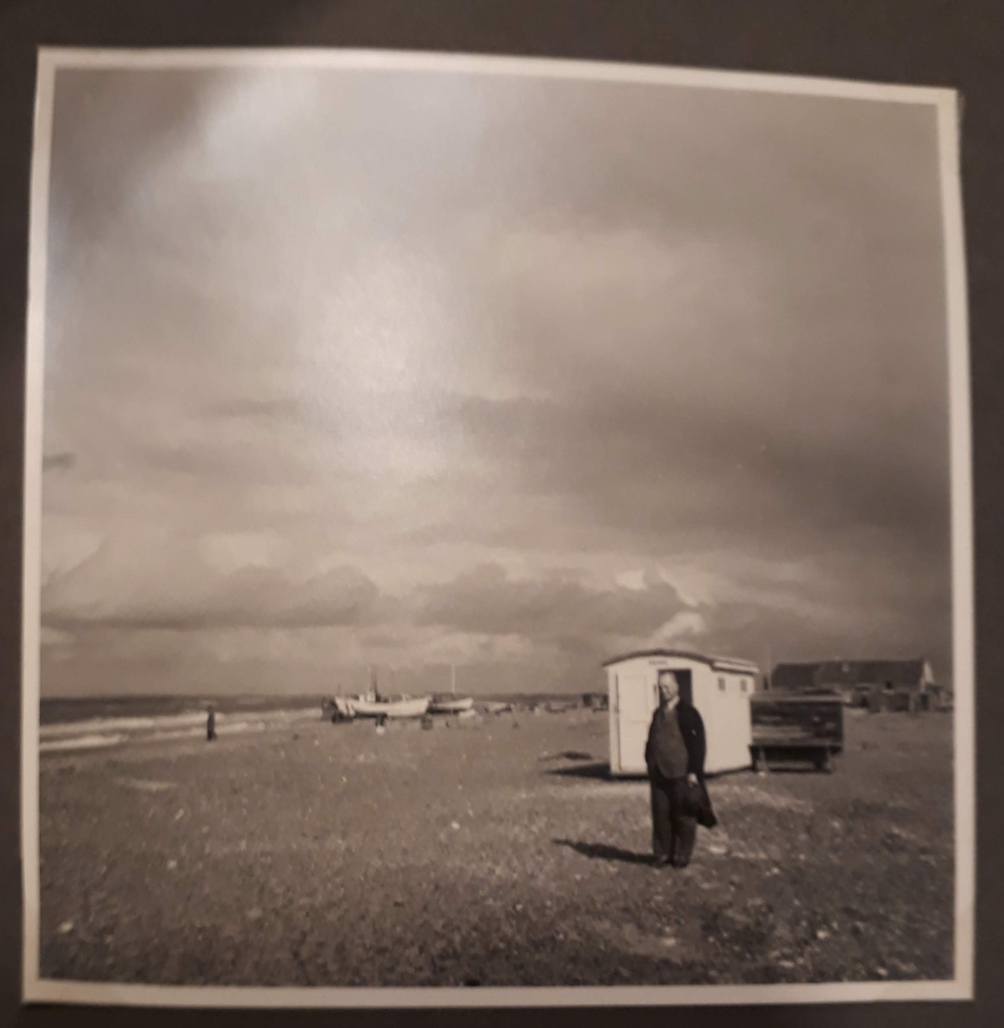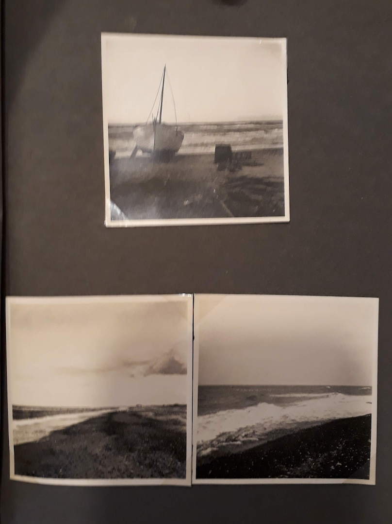 The album dates from 1941, by which time Germany had already occupied Denmark and Melms, the doctor’s wife, was working there as a translator. Both husband and wife seem to have had many friends in Denmark, but the photos of this wartime beach holiday are ghostly with absence. Instead, a vast welter of gathering clouds oppresses each photograph and dwarfs the few wanderers amongst the beach huts at Slettestrand.