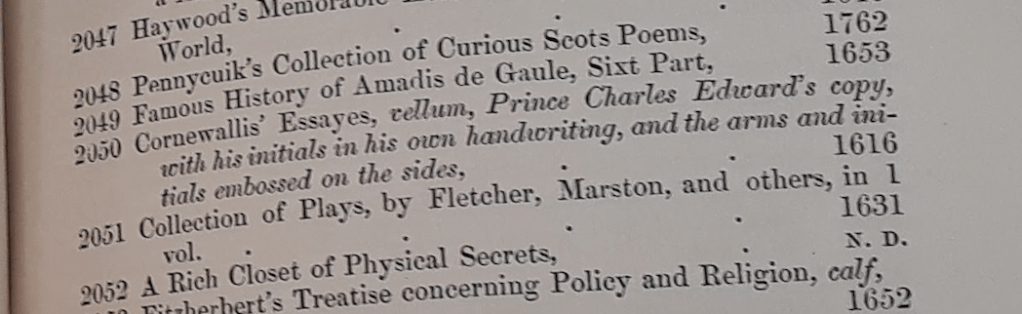 I am currently revising an odd article on the odder Charles Kirkpatrick Sharpe (1781-1851). Sharpe – failed minister, successful collector, occasional editor, prolific artist – was a friend of Sir Walter Scott and a fixture of the Edinburgh scene for many decades, but lacks modern recognition. He deserves it, though, and not least because of some of the remarkable things he collected. His library was sold in January 1852 and amongst a truly eclectic, but also carefully curated, collection is the following gem: