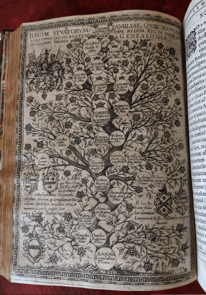 4o. [40], 588, [32]pp.; a-e4A-R8S4T-Oo8Pp-Rr4Ss6; 10 copperplate engravings: (1) fold-out map ‘Scotiæ regni antiquissimi accurata descriptio’ following unpaginated preliminaries; (2) stemma I of the early Scottish kings facing p. 83; (3) ibid. II facing p. 113; (4) ibid. III facing p. 131; (5) ibid. IIII facing p. 173; (6) spectacular stemma of the Stewarts from Banquho facing p. 261; (7) royal arms printed above letterpress on verso of p. 282; (8) stemma of the family of Henry VII of England and Elizabeth his wife facing p. 341; (9) stemma of the family of James V facing p. 367; (10) stemma IX, the family of Queen Mary, facing p. 463.