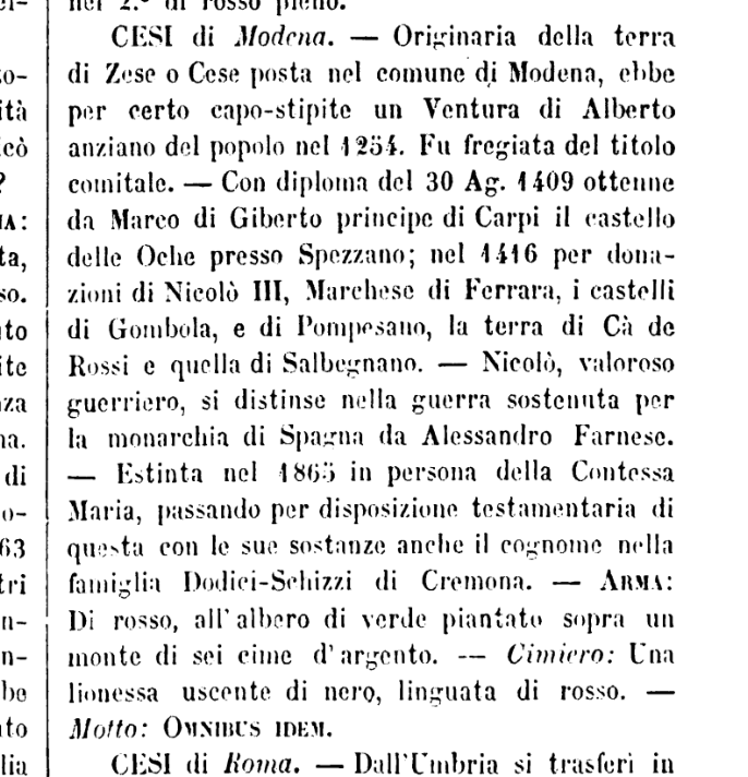 So I turned away from modern short cuts and began to work through the vast nineteenth-century heraldic dictionaries. Searching in Théodore de Renesse’s Dictionnaire des figures héraldiques, 7 vols. (Bruxelles, 1894-1903) under “monts sommés d’un meuble” (i.e., mountains topped with another figure, vi. 596-597) revealed nothing useful: crosses, eagles, and crowns but no trees. Giovanni Battista di Crollalanza’s Dizionario storico-blasonico delle famiglie nobili e notabili italiane estinte e fiorenti, 3 vols. (Paris, 1886-1890), however, eventually produced a more plausible option: the Cesi of Modena,