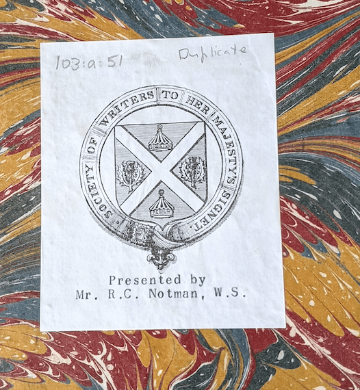 This is the mark of Henry Liddell, a former Bombay Civil Servant who retired in some splendour to Culross Abbey, collecting books and dying there in 1873. After Liddell’s sale in 1874, this volume presumably stayed in Scotland since it was subsequently donated to the Signet Library by Robert Carfrae Notman, WS (1899-1980), a sometime Fellow of the Scottish of Antiquaries of Scotland: